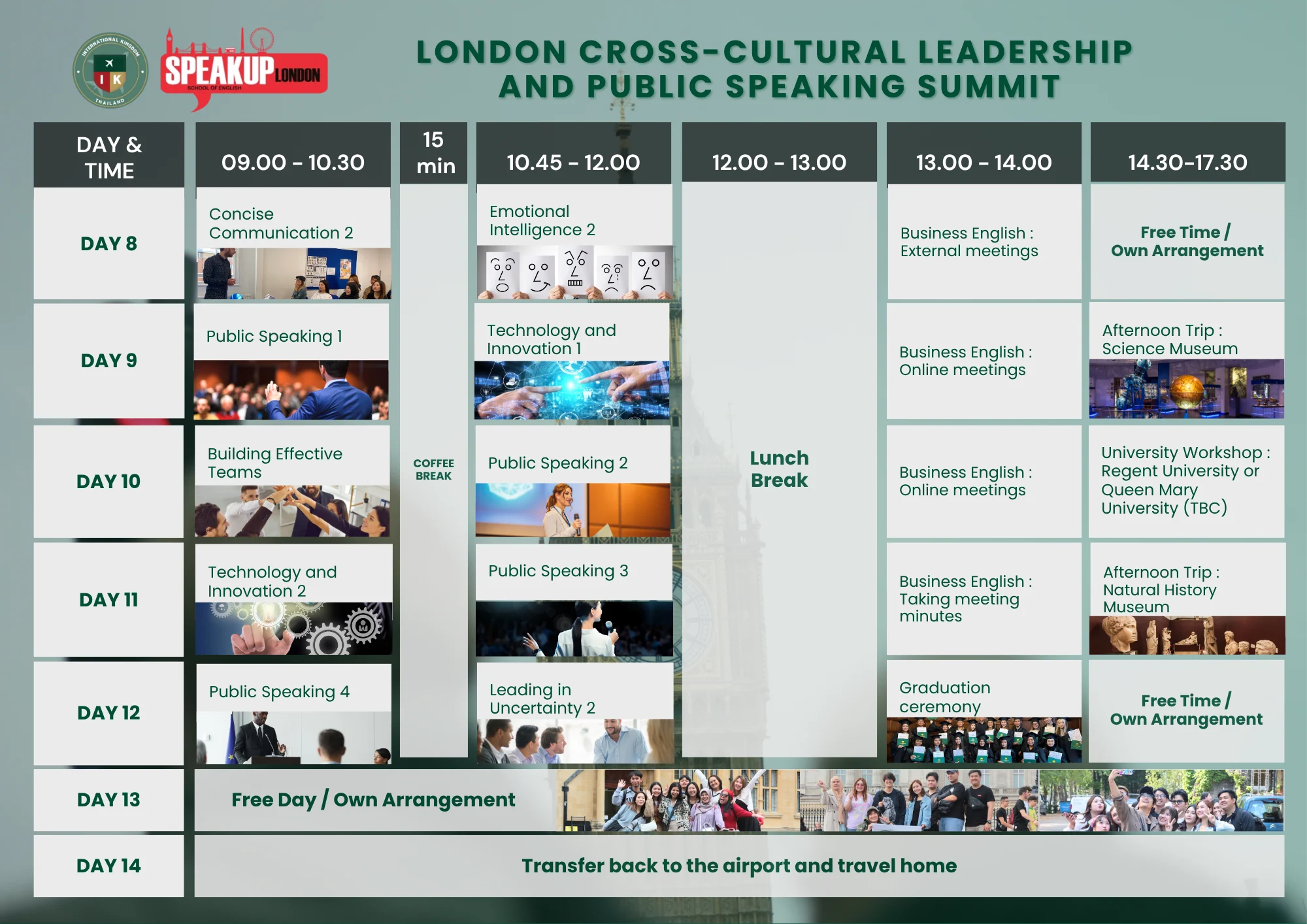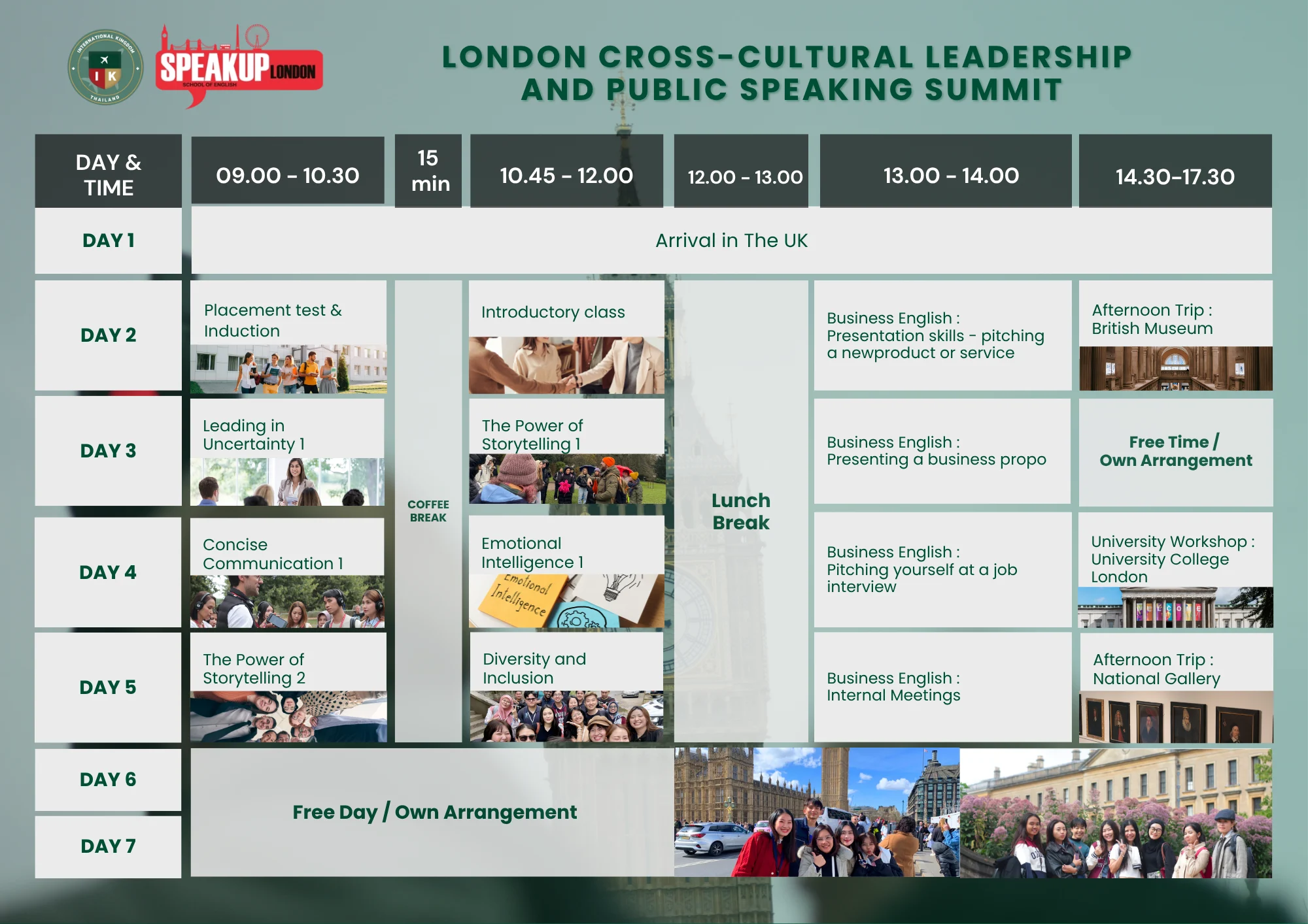 - ในช่วงเช้าของทุกวัน เวลา 9.30 – 12.30 น. ผู้เข้าร่วมจะได้ร่วม workshop การพูดในที่สาธารณะ (public speaking) พร้อมเข้าร่วมเรียนเกี่ยวกับทักษะความเป็นผู้นำและพัฒนาตนเอง ณ สถาบัน Speak Up London